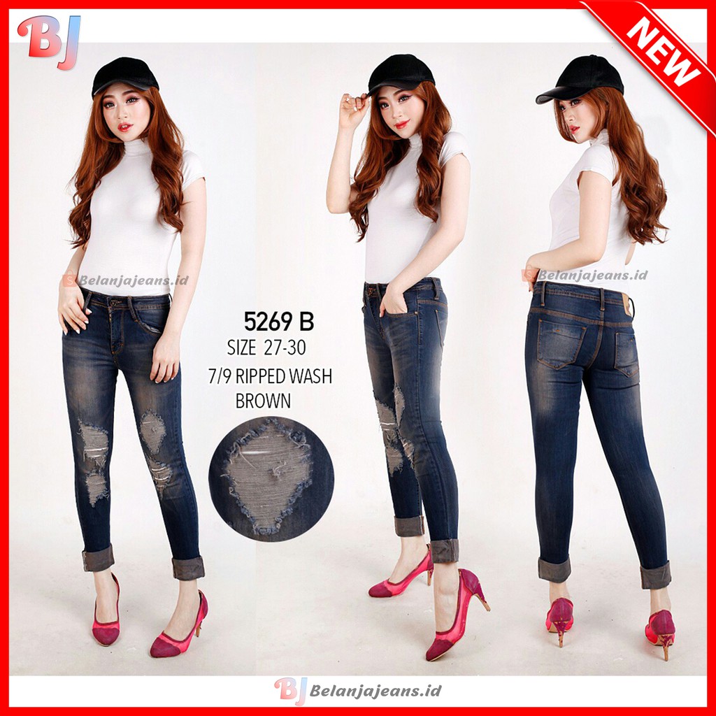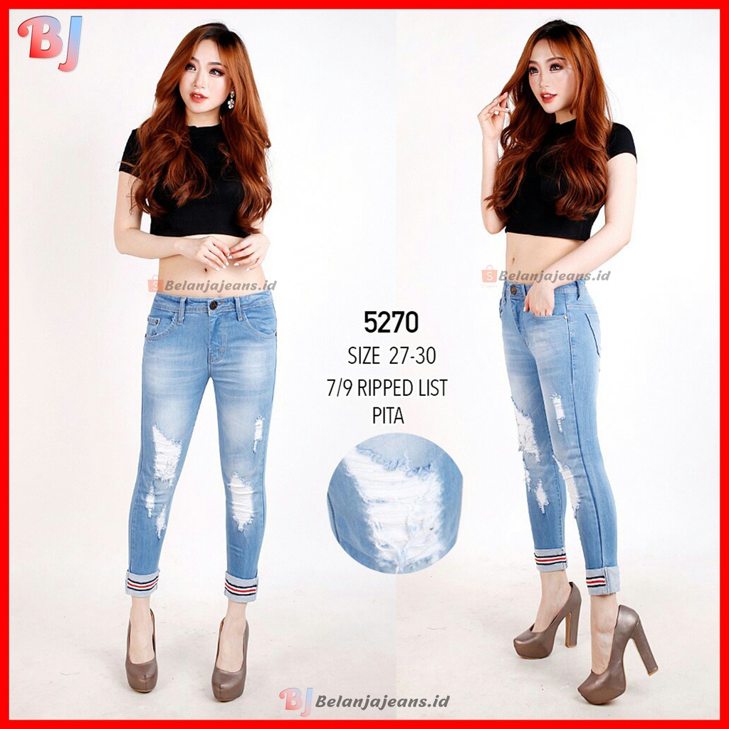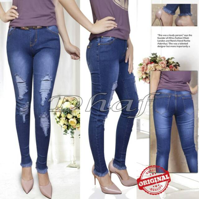 Nah bagi kamu yang ingin berpakaian lebih berani lagi. Worn out your favourite jeans. Pada bagian bawahnya celana ini menyerupai celana skinny yaitu mengerucut di bagian bawahnya hanya saja celana ini tidak seketat celana skinny jeans sehingga masih memberikan ruang yang cukup banyak untuk kaki bagian bawah. Kamu dapat mencoba memakai celana sobek wanita atau biasa disebut dengan ripped jeans.